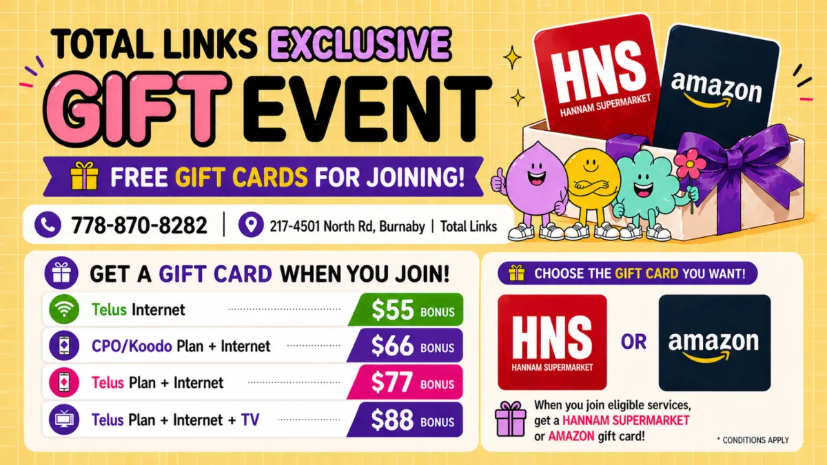 TotalLink is an authorized TELUS and Koodo dealer. We offer mobile phone plans, devices, home internet, home TV, and home security services.Our staff are dedicated to helping each customer find the most suitable plan and product based on their needs and usage. We’re happy to assist you in Korean or English — by phone, online, or in person at our store.